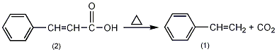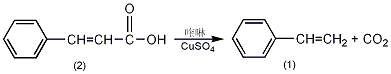 in a reaction flask equipped with a thermometer and an air condenser, add 59g (0.4mol) cinnamic acid (2), 129g quinoline, 6g anhydrous copper sulfate, and hydrogen quinone 0.15g, heated by electric heating mantle. when it rises to 250°c, the reactant becomes very black and bubbles are produced. when the temperature rises to 280-290°c, the decomposition speed accelerates, and the mixture of styrene and quinoline is evaporated at the same time. the boiling point gradually rises from 150°c to 200°c, and reaches 220-230°c at the end of the reaction. acidify the distilled solution with excess hydrochloric acid, separate the organic layer ①, and wash with water, sodium carbonate solution, and water in sequence. add 0.1g of hydroquinone, dry over anhydrous calcium chloride, and distill under reduced pressure. collect the fraction at 71-72°c/9.31kpa to obtain 35g of styrene (1), with a yield of 84%. note: ① the water layer contains quinoline hydrochloride. after steam distillation, 90% of the quinoline can be recovered. [34]