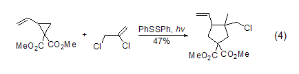 free radical reaction cyclopentane with functional groups can be prepared from vinylcyclopropane and trisubstituted propylene through photochemistry and dbu initiation (formula 4)[5].