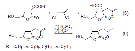 β-chloroalkyl lactone can be obtained by alkylation reaction of 4-alkoxymethyl-2-ethoxycarbonylbutanol compound and 2,3-dichloropropene, followed by hydrolysis and decarboxylation. the ester provides a new route for the synthesis of 2-acetonyl-4-alkoxymethylbutanol compounds (formula 5, formula 6)[6].