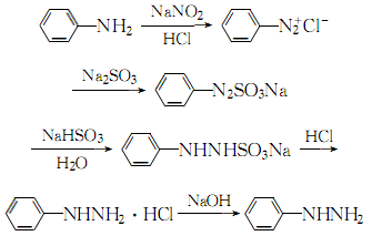2. mix aniline and 30% hydrochloric acid aqueous solution at a molar ratio of 1:2, cool to 2°c, and slowly add 6 mol/l sodium nitrite while controlling the temperature at 0 to 5°c. stir the solution until the starch potassium iodide test paper turns blue, continue stirring for 30 minutes, and obtain a diazonium salt solution for later use. at 10 to 15°c, use concentrated sodium hydroxide to adjust the 40% sodium bisulfite solution to a ph of 6 to 7, and cool it to 0 to 5°c. add the above diazonium salt quickly while stirring, and then continue stir for 15 minutes. when the ph value is 6 to 7, raise the temperature to 70 to 80°c, and slowly pass the concentrated hydrochloric acid through a catheter below the reaction liquid level. after adding, keep the temperature constant for 1 to 2 hours, cool to below 20°c, and filter. the resulting crystal is phenylhydrazine hydrochloride. dissolve the obtained phenylhydrazine hydrochloride with a small amount of water, add activated carbon for decolorization, add excess sodium hydroxide solution to the filtered filtrate, cool to 15-20°c and extract several times with benzene or ether, combine the extracts, and add anhydrous carbonic acid the potassium is dried, and then benzene or ether is recovered. the crude phenylhydrazine obtained is distilled at 2399pa, and the 137-138°c fraction is collected, which is pure phenylhydrazine. the process reaction is as follows: