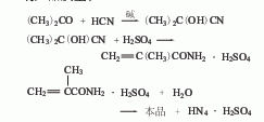 1. acetone cyanohydrin method acetone and hydrocyanic acid react in the presence of an alkali catalyst to generate acetone cyanohydrin, which then reacts with concentrated sulfuric acid to generate methacrylamide sulfate, which is then hydrolyzed to generate methacrylamide sulfate. acrylic. during production, it is required that acetone cyanohydrin and sulfuric acid do not contain moisture, otherwise acetone or α-hydroxymethyl isobutyrate will be produced and remain in the product, affecting product quality. the acetone cyanohydrin method is used to produce methacrylic acid. each ton of product consumes 898kg of sodium cyanide (>87%), 1100kg of acetone (98.5%), and 4080kg of sulfuric acid (fuming).