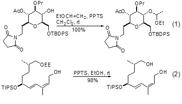 among the many hydroxyl protective groups, α-ethoxyethyl ether (ee) generated from ethyl vinyl ether and hydroxyl group is the most commonly used and convenient protection group. one of the bases. this reaction generally requires a strong acidic catalyst, tfa and tsoh can be used for this purpose, the most commonly used is ppts. this reaction can usually be completed by stirring at room temperature for several hours. in most cases, the yield of the product is more than 95% (formula 1)[1,2]. the ee protecting group can easily complete the deprotecting reaction under acidic conditions. ppts-etoh and aq. hcl-meoh are recommended methods (formula 2)[3,4].