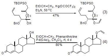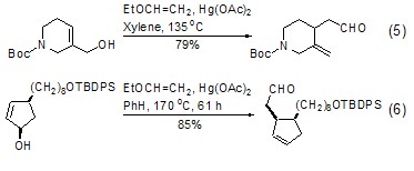 ethyl vinyl ether and olefin the vinyl transfer reaction of propyl hydroxyl group produces the corresponding vinyl ether product. the reaction is usually completed under the catalysis of mercury acetate. heating the product in toluene or xylene can induce the corresponding claisen rearrangement, making this reaction of important synthetic value. normally, the two-step reaction process can be completed under “one pot cooking” conditions (formula 5, formula 6)[9~11].