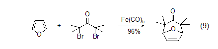the reaction between furan and dipolar substances gives 8-oxo-bicyclo[3.2.1]dec-6-en-3-one (formula 9)[10]. these [4+3] cycloaddition products can be easily converted into cycloheptanone, cycloheptantrienone and substituted cycloheptane systems, or substituted tetrahydrofuran compounds.