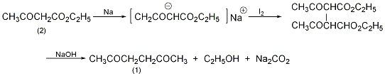 diethyl diacetyl succinate (3): in a reaction bottle equipped with a stirrer, dropping funnel, and reflux condenser (with a calcium chloride drying tube on the top), add 300 ml of anhydrous ether, metal 4.5g (0.2mol) sodium wire, slowly add 26g (0.2mol) acetoethyl ester (2) dropwise while cooling, control the dropping speed, do not make the reaction too violent, and do not boil the ether. after adding, leave it overnight to form a white gel-like precipitate. slowly add a solution of 25g (0.1mol) of finely ground iodine in 75ml of anhydrous ether while stirring until the solution completely fades (with a trace of iodine color). filter to remove sodium iodide. the diethyl ether was evaporated, and the residue was recrystallized with glacial acetic acid to obtain 16.5g of colorless crystalline diethyl diacetyl succinate (3), mp78°c, yield 65%. add 16.5g of compound (3) into the reaction bottle, then add 160ml of 10% sodium hydroxide solution, and reflux for 3 to 4 hours. after cooling, the alkaline solution was saturated with anhydrous potassium carbonate to precipitate an oily substance. extract three times with diethyl ether. after distilling off the diethyl ether, purify by distillation and collect the fraction at 192-195°c to obtain 4.8g of colorless liquid acetonyl acetone (1) with a yield of 65%. [1]