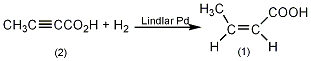 add 100mg of lindlar pd catalyst into the hydrogenation unit. 2-butynoic acid (2) 2g (0.0024mol), 100ml ethanol, shake thoroughly to make 2-butynoic acid solution. remove the air under reduced pressure, fill it with nitrogen, then extract the nitrogen, fill it with hydrogen, keep the hydrogen at factory pressure, and carry out hydrogenation under electromagnetic stirring. stop hydrogenation when hydrogen gas absorption reaches 540 ml. filter to remove catalyst. the solvent was evaporated under reduced pressure and cooled to below 15°c to precipitate white solid cis-butene-2-acid (1). recrystallize with petroleum ether (40~60℃), mp15℃. [1]