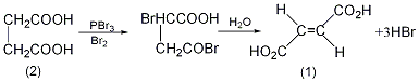 in a reaction bottle equipped with a stirrer, reflux condenser (connected to a hydrogen bromide absorption device), dropping funnel, and thermometer, add 118g (1.0mol) of pre-dried succinic acid (2) and newly distill it 212g of phosphorus tribromide ① was added dropwise with 307g of dry bromine (98.5ml) under stirring, and the addition was completed in about 2 hours. during the dripping process, the system became so viscous that it was difficult to stir. stop stirring and add all the bromine. leave overnight. heat in a water bath and stir for 4 hours to make the color of bromine disappear (do not allow bromine vapor to escape during heating). slowly pour the reactant into 300 ml boiling water, stir thoroughly, and precipitate crystals. add another 500 ml of water, heat to boiling, dissolve the solid matter, and filter. cool and crystallize. filter the precipitated crystals with suction, wash with water and dry to obtain 25-30g of fumaric acid. when the mother liquor is concentrated under reduced pressure to 1/2 volume, part of the product precipitates after cooling. a total of 58g of fumaric acid (1) was obtained, with a yield of 50%. note: ① phosphorus tribromide can be prepared by the following method: in a reaction bottle equipped with a stirrer, reflux condenser (connected to a hydrogen bromide absorption device), dropping funnel, and thermometer, add 41g of red phosphorus and 250ml of carbon disulfide. within 1.5h, 326g (105ml) of dry bromine and 250g of phosphorus disulfide (200ml) were added dropwise. the boiling point of phosphorus tribromide is 172.9°c. it should be kept in an airtight container. [1]