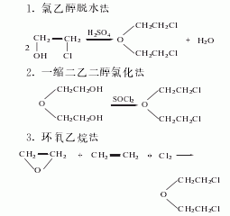 in a reaction bottle equipped with a stirrer, thermometer, dropping funnel, and reflux condenser (install a gas conduit to the so2 and hcl gas absorption bottle), add 500g of β, β’-dihydroxydiethyl ether (2) , cool to 0°c in an ice-salt bath, slowly add 1.2kg of thionyl chloride dropwise with stirring, control the temperature not to exceed 20°c, and complete the addition in about 4 hours. then react at room temperature for 3 hours. leave it overnight, add 5g of pyridine, and reflux for 3 hours. after cooling, slowly pour in ice water and stir thoroughly. let sit to layer. the organic layer was separated and washed with saturated sodium carbonate solution until neutral. dry the anhydrous calcium phosphate and distill under reduced pressure. collect the fractions at 55~60℃/1.0~1.2kpa to obtain β,β’-dichlorodiethyl ether ① (1), with a yield of 80%. note: ① it can also be prepared by heating and dehydrating chloroethanol in the presence of sulfuric acid. [26]