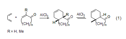 asymmetric diels- alder reactionthe cycloaddition reaction of 1,3-butadiene and methacrylate dienophile using camphoractimide in the presence of lewis acid produces cyclohexene carboxylate adduct. the larger stereocoordinated metal will cause the methacrylate to produce the s-trans conformation (formula 2)[3].