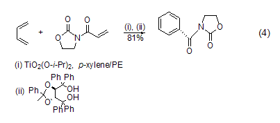 with 1,3-d in the cycloaddition reaction of dienes, the addition reaction using sugar as a chiral auxiliary compound has stereoselectivity [4]. the reaction of 3-o-acryloyldihydro-l-rhamnose (r = pivaloyl) gives (r)-cycloadduct (r /s=95:5) (formula 3).
