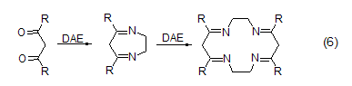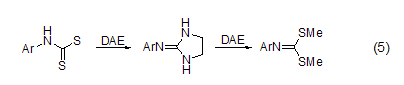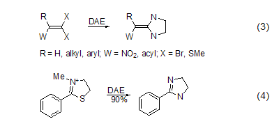 in a two-atom heterocyclic system dae is a very good reagent in the synthesis of . a similar reaction with 1-halogenated alkynes can produce 2-alkylene imidazoline or 2-alkylimidazoline. dae reacts with r(w)c=cx2 type compounds to form substituted 2-methylene imidazoline (formula 3)[4]. dae reacts with acid, ester, amide, dithioester, imino, nitrile, 2-arylazoline or 2-phenylthiazolium salt to generate 2-substituted imidazoline (formula 4)[5].