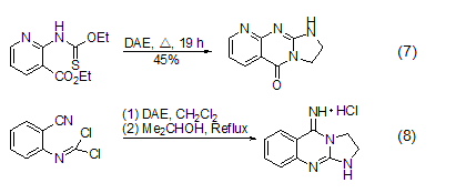 a molecule with two reaction points reacts with dae to form bicyclic products (formula 7, formula 8)[8,9]. heterocycles prepared by this method include pyrrole [1,2-a]imidazole, imidazole [3,4-a]imidazole, imidazole [1,2-b]quinoline, imidazole [1,2-c]pyrimidine, etc.