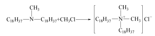 (2) quaternization reaction: quaternize dioctadecylmethyl tertiary amine with methyl chloride at a reaction temperature of 90 to 95°c and with isopropyl alcohol. use it as a solvent and add a small amount of sodium carbonate or sodium bicarbonate. in order to increase the solubility of methyl chloride and promote intermolecular contact and reaction, the reaction needs to be carried out under a pressure of 245 to 294kpa. the reaction formula is as follows: