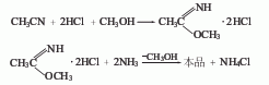 brief description of production method: it is obtained by addition and amination of acetonitrile, hydrochloric acid and methanol. circulate methanol in the turbulent ball tower with a pressure of less than 26.6kpa. dry hydrogen chloride is introduced under cooling to prepare a hydrogen chloride methanol solution with a concentration of 45%. then put it into the reaction tank, stir and cool to 10-5°c, add acetonitrile dropwise, and keep it at 15-20°c for 6 hours to obtain iminomethyl ethyl ether hydrochloride. put it into the pre-prepared 13% ammonia methanol solution, ammonolyze it at 0-40°c, keep the ph value at 7-8, stir for 2-3 hours, cool n to below 30°c, centrifuge and filter out the ammonium chloride. methanol is recovered from the filtrate, and the finished product is obtained by cooling and filtering. weight input ratio: acetonitrile: hydrogen chloride methanol solution (45%): ammonia: methanol = 1:3:1.05:4.3. the yield is 82%-85%.