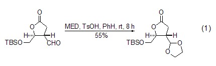 the acetal exchange reaction between med and aldehydes occurs in the presence of acid catalyst to generate new ethylene glycol acetal. p-toluenesulfonic acid or camphorsulfonic acid are the most commonly used catalysts for this reaction. compared with directly using ethylene glycol to heat dehydration under acidic conditions, the reaction can be carried out under very mild conditions. in most cases, it can be completed by stirring at room temperature for several hours, which is very important for substrates with acid-sensitive functional groups (formula 1)[1,2].