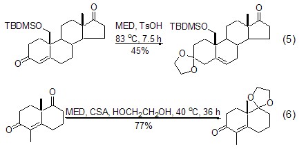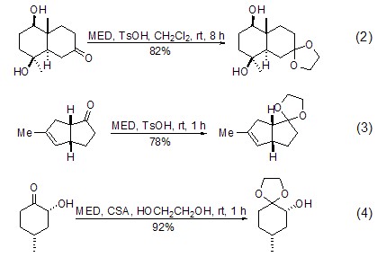 under almost the same conditions, med conveniently converts ketones into ethylene glycol ketals. ch2cl2 or benzene are the most commonly used reaction solvents, and tertiary alcohols with high acid sensitivity are not significantly affected under these conditions (formula 2)[3,4]. this reaction can also use excess med as the reaction solvent (formula 3)[5]. the recommended method is to use excess med and add a small amount of ethylene glycol as a catalyst to obtain a better yield (formula 4)[6,7].