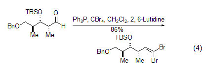 corey-fuchs reaction in the presence of ph3p and 2,6-lutidine, aldehydes react with cbr 4 reacts in dichloromethane to form terminal dibromoene (formula 4)[5].