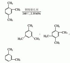 3.isomerization method using mesitylene as raw material, the single-pass yield rate of1,3,5-trimethylbenzene obtained by fractionation21.6%, the purity is 95% and above, and the by-product is 4% -7% of tetramethylbenzene and 9% of xylene. average reactor bed temperature260, pressure 2.35mpa, emptying 1.0h-1, reforming hydrogen and oil the molar ratio is 10: 1, and the catalyst is aluminum-hydrogen-deficient mordenite: copper: nickel: binding agent=85.2: 0.5: 15. under these conditions, the conversion rate of mesitylene is 46%, the selectivity is 47%, and mesitylene is produced in one pass the yield is 21.6%. japan’s mitsubishi gas company uses hf-bf3 to separate and isomerize xylene, and the by-product contains high concentrations of 1,3,5 –the high boiling substance of trimethylbenzene can be obtained by distillation and refinement.