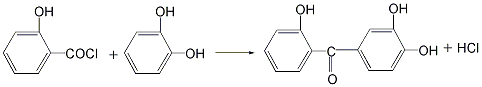 (2 ) synthesis of 2,2′,4-trihydroxybenzophenone: heat salicylic acid chloride under stirring. when the temperature rises to 80°c, add 3 parts of resorcinol and 0.07 parts of anhydrous pyridine to carry out the reaction. the hydrogen chloride gas produced by the reaction must be treated as necessary. the reaction temperature can be controlled at about 100°c and continued under stirring until only a small amount or no hydrogen chloride gas is released. the reaction solution is filtered, distilled, distilled under reduced pressure, cooled, crystallized, washed with alcohol, and dried to obtain 2,2’,4-trihydroxybenzophenone.