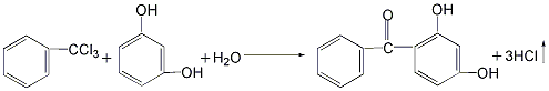 2. use resorcinol and trichlorotoluene as raw materials in the reaction kettle add resorcinol and appropriate amount of water and stir to dissolve. then add trichlorotoluene and an appropriate amount of alcohol, and stir to make the materials completely miscible. the reaction was carried out at 40°c, and 2,4-dihydroxybenzophenone was generated and precipitated as a solid. after the reaction is completed, the reactants are filtered, and the filter cake is washed with dilute sodium bicarbonate solution and then dried to obtain the finished product. the yield of this method can reach 95%, the raw materials are easy to obtain, and the product cost is low. however, the product has a darker color and is not easy to decolorize and purify.