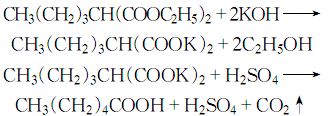 diethyl n-butyl malonate (4): in a reaction bottle equipped with a stirrer, reflux condenser (installed with a calcium chloride drying tube), and dropping funnel, add 2500 ml of absolute ethanol, add 115 g (5 mol) of metallic sodium in batches, and stir at about 60°c. reaction, after all the sodium has reacted, add 825g (5mol) of diethyl malonate (2) dropwise. after the addition is completed, stir the reaction for 30 minutes. add 685g (5mol) of n-bromobutane (3) dropwise. the reaction heat is about the addition was completed in 3 hours, and then the reflux reaction was continued for 2 hours. change to a distillation device and evaporate the ethanol under reduced pressure. after cooling, add 2l of crushed, stir thoroughly to dissolve the generated sodium bromide, separate the water layer, and distill the oil layer under reduced pressure. collect the fractions at 140~145℃/5.33kpa to obtain diethyl n-butylmalonate (4) d4 250.983, nd251.4250. easily soluble in ethanol, ether, acetone, ethyl acetate, insoluble in water. caproic acid (1): in a reaction bottle equipped with a stirrer, reflux condenser, and dropping funnel, add 200 g of potassium hydroxide and 200 ml of water. slowly add 200g (0.925mol) of diethyl n-butylmalonate (4) while stirring, and the reaction proceeds vigorously and refluxes. when all the ester was added, the reaction was refluxed for 3 hours. after cooling, the upper organic layer was separated, and the aqueous layer was extracted with diethyl ether. combine the organic layers and dry over anhydrous sodium sulfate. after evaporating the ether, continue distillation and collect the fractions at 200-206°c to obtain 80g of hexanoic acid (1) with a yield of 75%. [2]