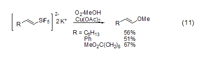 copper acetate can also achieve carbon- oxidation reaction of metallic bonds. in an atmosphere of methanol and oxygen, a catalytic amount of copper acetate can promote the cleavage of the vinyl si-c bond to obtain a vinyl ether compound (formula 11) [8]. the reaction has a high degree of stereoselectivity. trans-enol ether is completely obtained. the corresponding aldehydes can also be obtained in the presence of water.