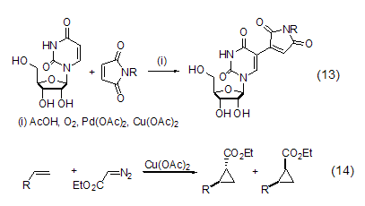 copper acetate can also be used as a palladium reagent the oxidant in the catalytic reaction re-oxidizes the reduced palladium reagent into pd(ii), and then re-enters the catalytic cycle (formula 13)[10]. in addition, the combination of copper acetate and chiral imine ligands can induce the asymmetric cyclopropylation reaction of alkenes and diazoacetates (equation 14)[11].