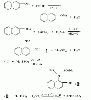 1. using 2-naphthol as raw material, it is obtained by alkali fusion, nitrosation and sulfonation. raw material consumption quota: 2-naphthol (99%) 840kg/t, sodium bisulfite (98%) 1500kg/t, sulfuric acid (92.5%) 1600kg/t. 2.dissolve β-naphthol and sodium hydroxide in water at a ratio of 1:1 (molar ratio), heat if necessary, the temperature should not exceed 50°c, completely after dissolving, cool to 0°c, add sodium nitrite solution in the same amount (molar ratio) as β-naphthol while stirring, then slowly add 40% sulfuric acid at 0°c to a ph value of 2 to 3, and control the temperature not to exceed 5℃, let it stand after adding sulfuric acid, filter it after the precipitation is complete, wash the precipitate with water, the resulting precipitate is 1-nitroso-2-naphthol, add water and stir into a paste, adjust ph=6~7, add sulfurous acid at a time for sodium hydrogen solution, control the temperature at 50°c and stir until it is completely dissolved. dilute the filtrate obtained by filtration with water and slowly add concentrated sulfuric acid while stirring. stir evenly and let it stand for 4 to 6 hours. filter and wash the resulting crystals with water several times and dry. to constant weight, which is the finished product 1-amino-2-naphthol-4-sulfonic acid.