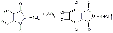 1. preparation by chlorination of phthalic anhydride. add phthalic anhydride, 40% fuming sulfuric acid and a small amount of iodine into the reaction kettle, stir and heat to 70°c, add dry chlorine gas, react in the dark for 50 hours, raise the temperature and continue the reaction at 100°c. after 1.5h, add some reaction medium (40% oleum). and raise the temperature to 220°c. after the reaction for a certain period of time, cool n, put the product into a large amount of water, crystallize and precipitate, filter and wash with cold water to obtain the finished product. 2. preparation by chlorination of phthalic anhydride using hydrosulfonic acid as solvent and lewis acid such as aluminum trichloride as catalyst. add a certain amount of chlorosulfonic acid, catalyst and phthalic anhydride into a special chlorination kettle, and then raise the temperature according to a certain program. when the temperature in the reaction kettle rises to 80°c, chlorine gas will be introduced and the solvent and catalyst will be recovered. the distillation temperature shall not exceed 220℃ to avoid product decomposition. after the remaining material is cooled, it is washed with cold water, centrifuged and dehydrated, and dried at 150°c to obtain the finished product.