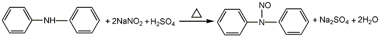 1. obtained from the reaction of diphenylamine and sodium nitrite in the presence of sulfuric acid: the nitrosation reaction uses ethanol or xylene (or chlorobenzene) as the solvent, the sodium nitrite solution content is 40%, and the concentrated sulfuric acid content is 30% , react at about 26℃ for 2.5-3h. the reaction product is washed with water until the ph value is 6-7. when ethanol is used as the solvent, a solid product is obtained after drying; when xylene or chlorobenzene is used as the solvent, a liquid product is obtained, and the product needs to be dried with calcium chloride.