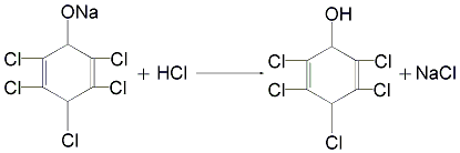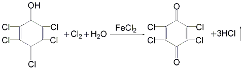 1. obtained from the oxidation of pentachlorophenol. add 20% sodium pentachlorophenol solution into the reaction kettle, acidify with equimolar 35% hydrochloric acid, and stir into a paste. then add anhydrous ferric chloride at 6% of the weight of sodium pentachlorophenate, raise the temperature to above 70°c, start passing chlorine, and keep the reaction temperature above 95°c until the reaction oil is completely clear and particle-free. separate the water layer, remove the homogeneous substance and add 98% concentrated sulfuric acid to acidify it to obtain tetrachlorobenzoquinone.