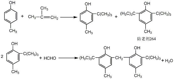 under the catalysis of 732# strong acidic ion exchange resin, p-cresol undergoes alkylation reaction with isobutylene at about 60°c. after the reaction is completed, the catalyst is filtered off, and the filtrate is added to a methanol-caustic soda solution to precipitate antioxidant 264. after filtration, the anti-aging agent 264 is recrystallized in alcohol, then filtered and dried to obtain the anti-aging agent 264 as a by-product. the filtrate after filtering out the antioxidant 264 is subjected to neutralization, distillation (methanol recovery), water washing, vacuum distillation, crystallization and filtration to obtain the intermediate product 2-tert-butyl-4-cresol. use 200# gasoline as a solvent and formaldehyde in a sulfuric acid medium to conduct a condensation reaction at 90-95°c. the reaction product is neutralized, filtered, washed, dried, powdered, and packaged to obtain the finished product.