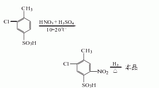 nitrate 3-chloro-4-toluenesulfonic acid with nitric acid below 30°c, react for 3 hours and then salt out with saturated brine at 100°c to obtain 2-nitro-5-chloro-p-toluenesulfonic acid: add 2-nitro-5-chloro-p-toluenesulfonic acid to water, add acetic acid and iron powder, and reduce under boiling conditions. filter out the iron powder from the reaction, add hydrochloric acid to make the filtrate acidic, and crystallize 2-amino-5-chloro-p-toluenesulfonic acid.