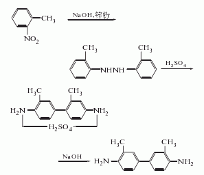 1. use zinc powder (or ferrosilicon powder) to reduce o-nitrotoluene to 2,2′-dimethyl symmetric diphenylhydrazine in caustic soda medium, and then add 22.5% sulfuric acid and sodium metabisulfite (or in the presence of hydrochloric acid), rearrange to form 3,3′-dimethylbenzidine sulfate (or hydrochloride), add 30% liquid caustic soda, and deacidify to obtain the finished product.