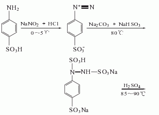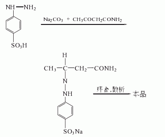 after diazotization with p-aminobenzene sulfonic acid, sodium nitrite and hydrochloric acid,reduction with sodium bisulfite and sodium carbonate, hydrolysis with sulfuric acid to obtain p-sulfophenylhydrazine, condensation, cyclization and acid precipitation with acetyl acetamide to obtain pyrazolone.