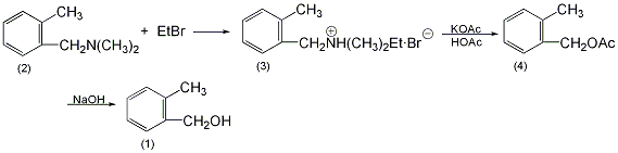 o-methylbenzyldimethylethylammonium bromide (3): in a reaction bottle equipped with a stirrer and a reflux condenser, add 29.8g of o-methylbenzyldimethylamine (2) and 32.7g of bromoethane (0.3mol), 40ml of absolute ethanol, heated to reflux for 1h. add 10.8g (0.1mol) of ethyl bromide and continue the reflux reaction for 3 hours. the ethanol and unreacted bromoethane were distilled off under reduced pressure. add 300 ml of anhydrous ether to the remainder, filter the precipitated solid, wash the filter cake with ether, and dry under vacuum to obtain 47.5-49 g of compound (3) with a yield of 92%-95%. o-methylbenzyl acetate (4): in a reaction bottle equipped with a stirrer, add 38.7g (0.15mol) of compound (3), 24.6g (0.3mol) of molten sodium acetate, and 100ml of glacial acetic acid, and heat to reflux for 24 hours. . cool to room temperature, pour 250 ml of water, and neutralize with 84 g of sodium bicarbonate. extract with ether three times, combine the ether layers, wash with saturated sodium bicarbonate solution and saturated brine in sequence, and dry over anhydrous magnesium sulfate. recover ether and then distill under reduced pressure to collect 119~121℃/2.0kpa or 129~131℃/2.8kpafraction, 21.6~22.4g of o-methylbenzyl acetate (4) was obtained, with a yield of 88%~91%. o-methylbenzyl alcohol (1): add 50 ml of water, 5 g of sodium hydroxide (0.12 mol), 16.4 g (0.1 mol) of the above compound (4), and 50 ml of methanol into the reaction bottle, and heat to reflux for 2 hours. after cooling, add 50 ml of water and extract with ether three times. the ether layers were combined, washed with water, washed with saturated brine, and dried over anhydrous sodium sulfate. after recovering the ether, add 50 ml of petroleum ether and freeze in an ice-salt bath. the precipitated solid was suction-filtered, washed with cold petroleum ether, and dried to obtain 11.6 to 11.8 g of o-methylbenzyl alcohol (1), with a yield of 95% to 97%. [1]