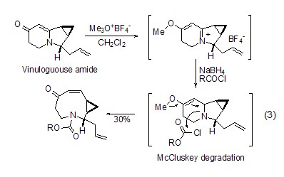 amide substrate both o-alkylation and s-alkylation of sulfamide substrates can react well under the action of meerwein salt, and the generated imine ester has higher reaction activity, such as in the total synthesis of indolizomycin, the generated imide ester is reduced by sodium borohydride to obtain a nine-membered ring natural product (formula 3)[2].