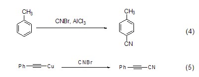 cyanogen bromide can synthesize cyanide compounds. the reaction of toluene and cyanogen bromide under lewis acid catalysis synthesizes aromatic cyanide compounds (formula 4)[5]; the reaction of alkynyl copper salts and cyanogen bromide produces alkynyl cyanide (formula 5)[6], this reaction provides an effective method for the synthesis of alkynyl cyanides.