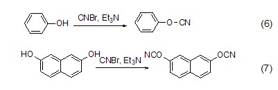 cyanogen bromide can also synthesize cyanide compounds and dicyanoester compounds. catalyzed by organic bases, it reacts with phenol and 2,7-naphthodiol to form cyanophenyl ester (formula 6)[7a] and 2,7-naphthodiphenol dicyanoester (formula 7) )[7b]. they are important intermediates in the field of organic synthesis and have a wide range of uses.