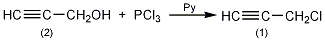 in a reaction bottle equipped with a stirrer, thermometer, reflux condenser, and dropping funnel, add kerosene 1.2 kg, 1kg of phosphorus trichloride, cool to below 15°c, slowly add a mixture of 1kg of propargyl alcohol (2) and 0.3kg of pyridine dropwise while stirring. after the addition is completed, the reaction is refluxed for 4 hours. cool to 20°c, pour into ice water, and stir the ingredients. let stand and separate the water layer. the oil layer is adjusted to ph 5-6 with 5% sodium carbonate aqueous solution, and the water layer is separated. the oil layer was washed twice with water, dried over calcium chloride, filtered, and distilled. the fractions at 50-60°c were collected to obtain propargyl chloride (1) with a yield of 60%. [1]