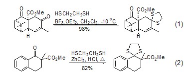 2. the condensation reaction of 1,2-ethanedithiol with aldehydes, ketones and acetals produces 1,3-dithiapentane, which is used for carbonyl protection (formula 1, formula 2)[1,2]. its stability, condensation selectivity and carbonyl regeneration conditions are similar to those of 1,3-propanedithiol[3]. esters and lactones can be protected with ketene dithioacetals and/or dithioprolactones.