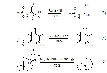 1,3-dithiapentane under the conditions of raney nickel, sodium amide or sodium/hydrazine, the direct desulfurization reaction reduces c=o to ch2 (formula 3~formula 5)[4] .