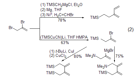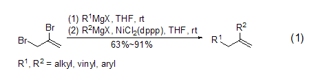 coupling reaction with organic metals the allyl and vinyl bromide atoms of 2,3-dibromopropene can be selectively substituted through continuous two-step cross-coupling. (formula 1)[1].