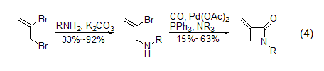 nucleophilic with nitrogen reaction of reagents under co conditions, under the action of catalytic amounts of palladium (ii) acetate and triphenylphosphine, different 2-bromopropenylamine derivatives can be used to synthesize α -methylene-β-lactam (formula 4)[8,9].
