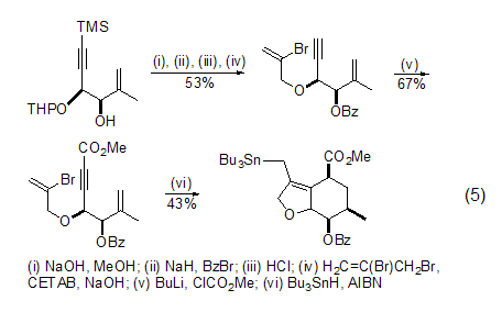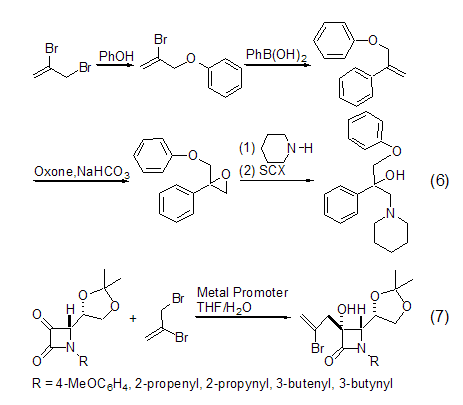 with oxygen and sulfur reactions of nucleophiles intramolecular radical cyclization reactions are widely used in the organic synthesis of carbocyclic structures. for example, 2-bromoallyl ether and 2,3-dibromopropene undergo allylation reaction through phase transfer (formula 5)[10].