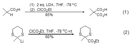ethyl chloroformate can effectively react with compounds containing active methylene groups to achieve ethoxycarbonylation. usually alkyl and aryl carboxylic acids can be treated with the non-nucleophilic base lithium diisopropylamide lda to activate α-h, and then react with ethyl chloroformate to obtain malonic acid. monoesterification product (formula 1)[1]. α-lithiated nitrile, carboxylic aldehyde and 1,3-dithiane can directly interact with ethyl chloroformate to achieve ethoxycarbonylation reaction (formula 2)[2].