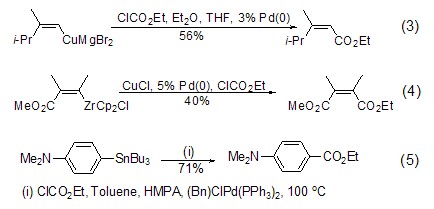 except those containing active methylene in addition to compounds, vinyl anions can also react effectively with ethyl chloroformate. for example, vinyl copper reacts with ethyl chloroformate under the catalysis of pd(0) to obtain α,β-reaction of unsaturated esters (formula 3)[3], for another example, vinyl zirconium reacts with ethyl chloroformate under the catalysis of cucl/pd(0) to obtain bifunctional olefins ( formula 4)[4]. and aryl, vinyl and heterocyclic tin reagents can also be catalyzed by metal palladium complexes to obtain ortho-unsaturated ethyl ester products (formula 5)[5] in high yields.