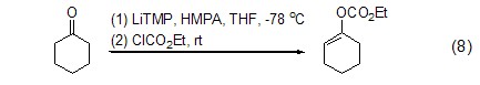 ethyl chloroformate can also realize the acylation reaction of functional groups containing o, n and s, such as cyclohexanone. the lithiated enol structure is obtained by treatment with lithium reagent, and then reacts with ethyl chloroformate to achieve the ethyl ester reaction on o (formula 8)[8].
