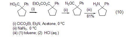 ethyl chloroformate and carboxylic acid can directly react under alkaline conditions to form a mixed acid anhydride, which can then achieve other reactions, such as the preparation of acyl azide compounds (formula 10)[10].