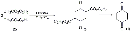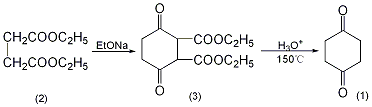 1,4-cyclohexanedione-2, 3-dicarboxylic acid ethyl ester (3): in a reaction bottle equipped with a stirrer and a reflux condenser, add 1000 ml of absolute ethanol, and add 92 g (4 mol) of clean metallic sodium in batches. the reaction is exothermic and can be used if necessary. water bath cooling. after the metallic sodium has completely reacted, add 350g (2mol) of diethyl succinate (2) in batches and reflux for 25 hours under stirring. a large amount of solid precipitated during the reaction. the ethanol is distilled off. cool and neutralize to weak acidity with 10% dilute sulfuric acid. crush the lump, suction filter, wash thoroughly with cold water, and dry to obtain 1,4-cyclohexanedione-2,3-dicarboxylic acid ethyl ester ① (3) 130g, mp126~128 ℃. the yield is 50%. 1,4-cyclohexanedione (1): in a reaction bottle equipped with a stirrer and a reflux condenser, add 130g (0.508mol) of compound (3), 4l of water, 750g of phosphoric acid, and 100ml of ethanol, and conduct a reflux reaction for 90 hours. concentrate to half the volume under reduced pressure and extract repeatedly with chloroform. chloroform was evaporated under reduced pressure to obtain crude product. distill under reduced pressure, collect the fraction at 125~135℃/2.67kpa, and solidify after cooling to obtain 1,4-cyclohexanedione ② (1) 29g, mp74~76℃, yield 52% . note: ① the possible mechanism of this reaction is as follows. ② react 1,4-cyclohexanedione-2,3-dicarboxylic acid ethyl ester (3) with an equal amount of water at 4.5~5.9mpa and 180~185℃. the yield can reach more than 65%. [2]